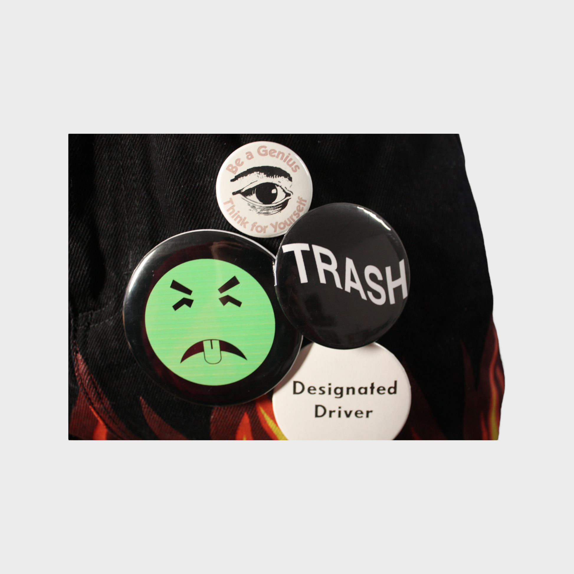 -(4) JRAY, DONATELLA, MR. YUCK & TRASH BADGES MADE BY JRAY